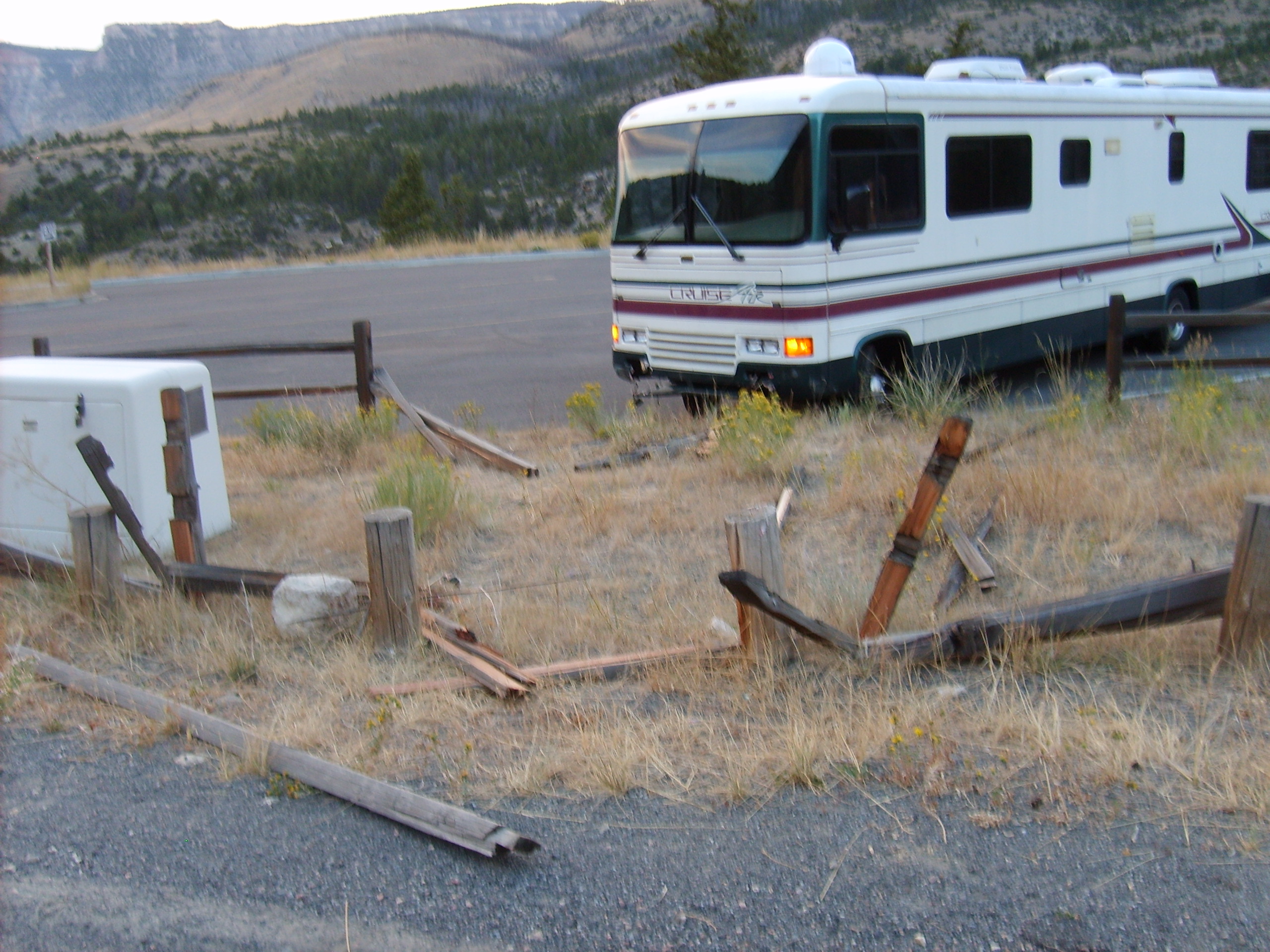 The scene of my RV accident on US-14 above Greybull, Wyoming in the Big Horn National Forest. This shows the damage after my RV was pulled off of the embankment.