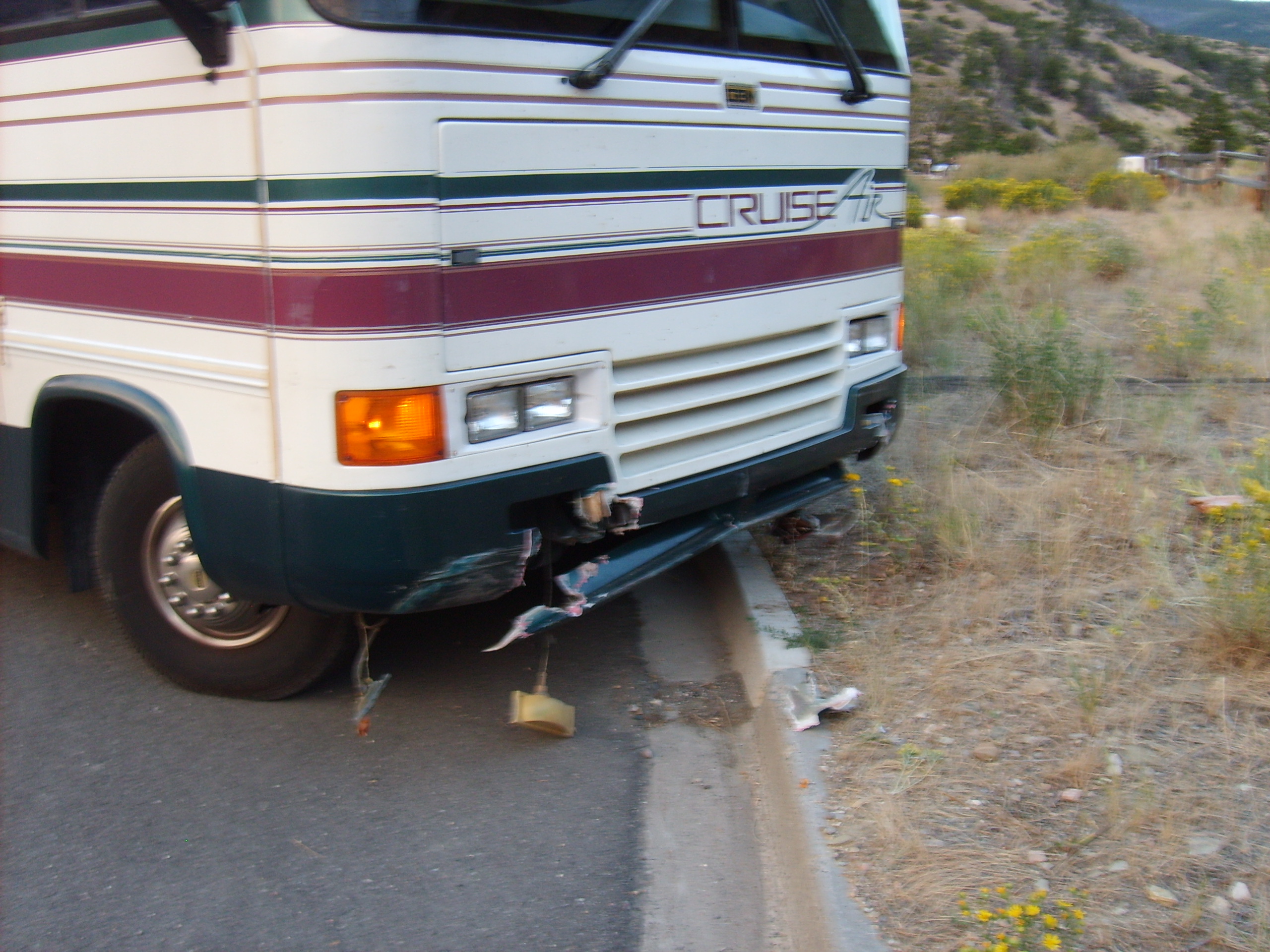 This is the front bumper on my RV after the accident. It was destroyed. A new bumper has to be fabricated from scratch to fix the damage.